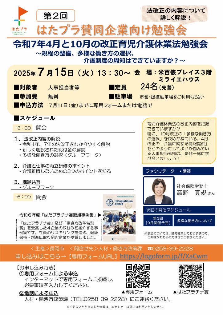長岡市はたプラ勉強会 令和7年4月と10月の改正育児介護休業法勉強会